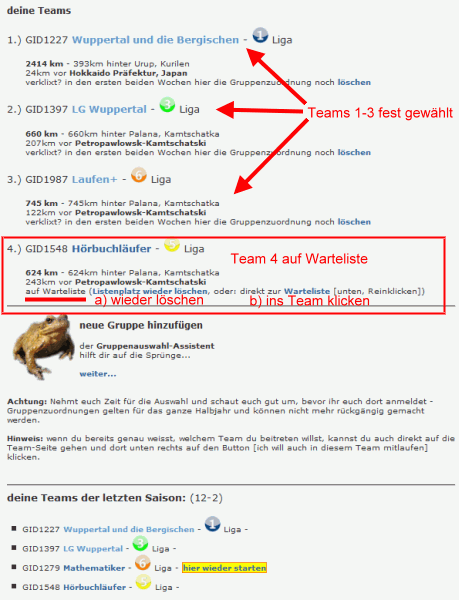 Über die Teamseite (unten: Warteliste) kann einen dann jeder rasch ins Team klicken.